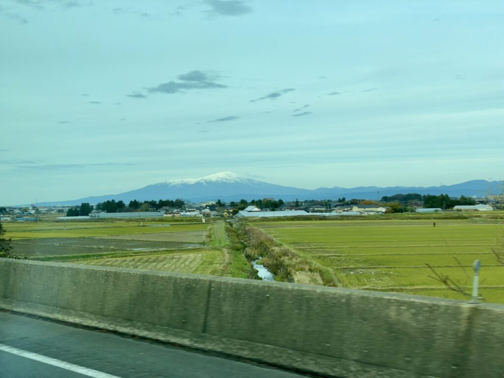 寒河江市を過ぎるあたりで月山が現れ、さらに走ると鳥海山が雄大な姿を見せます。