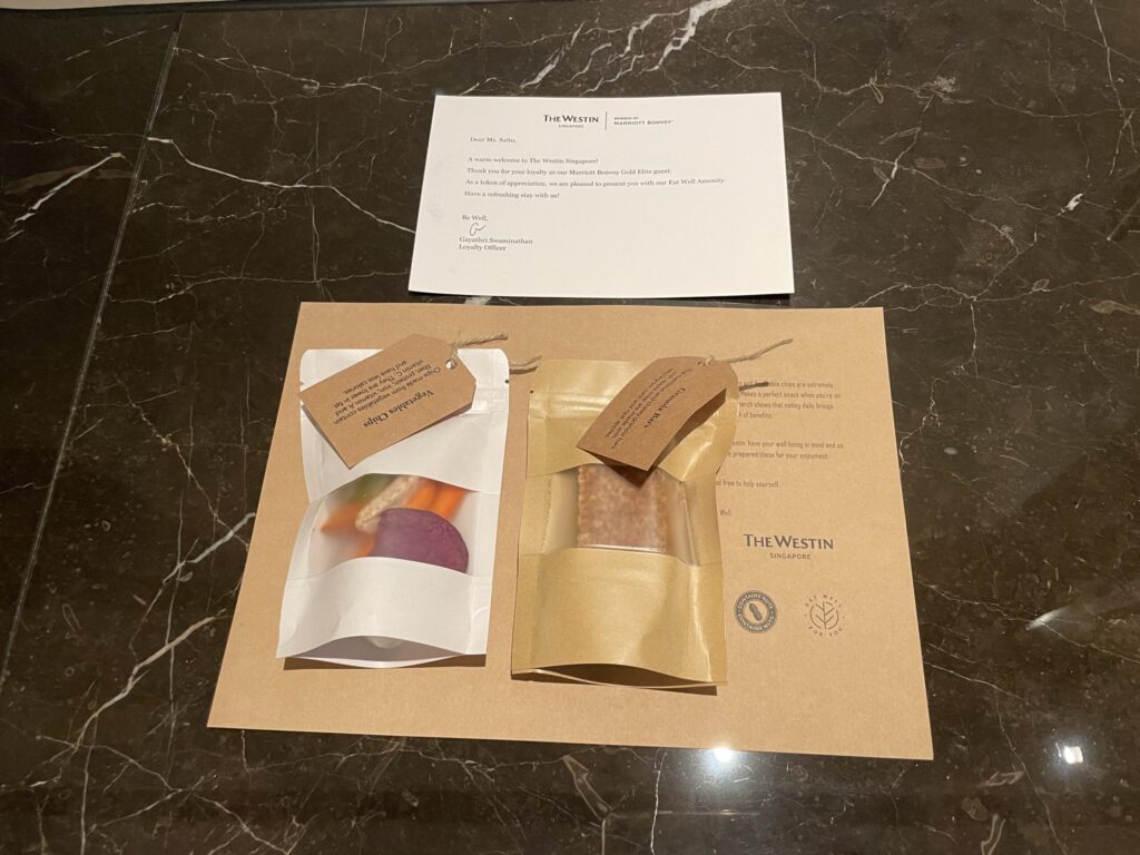 ✅️ ウェルカムアメニティ:マリオット・ボンヴォイのゴールド会員特典として、シリアルバーと野菜チップスをウェルカムアメニティとしていただきました。小腹が空いたときに嬉しいちょっとした心遣いです。