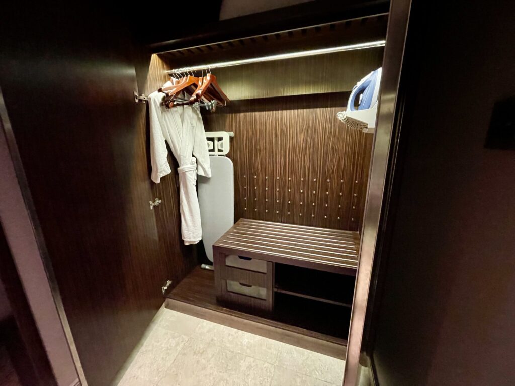 ✅️ ウォークインクローゼット:お部屋とバスルームの間にあり、バスローブ・スリッパ・アイロン・アイロン台が整然と並び、長期滞在でも快適に過ごせます。