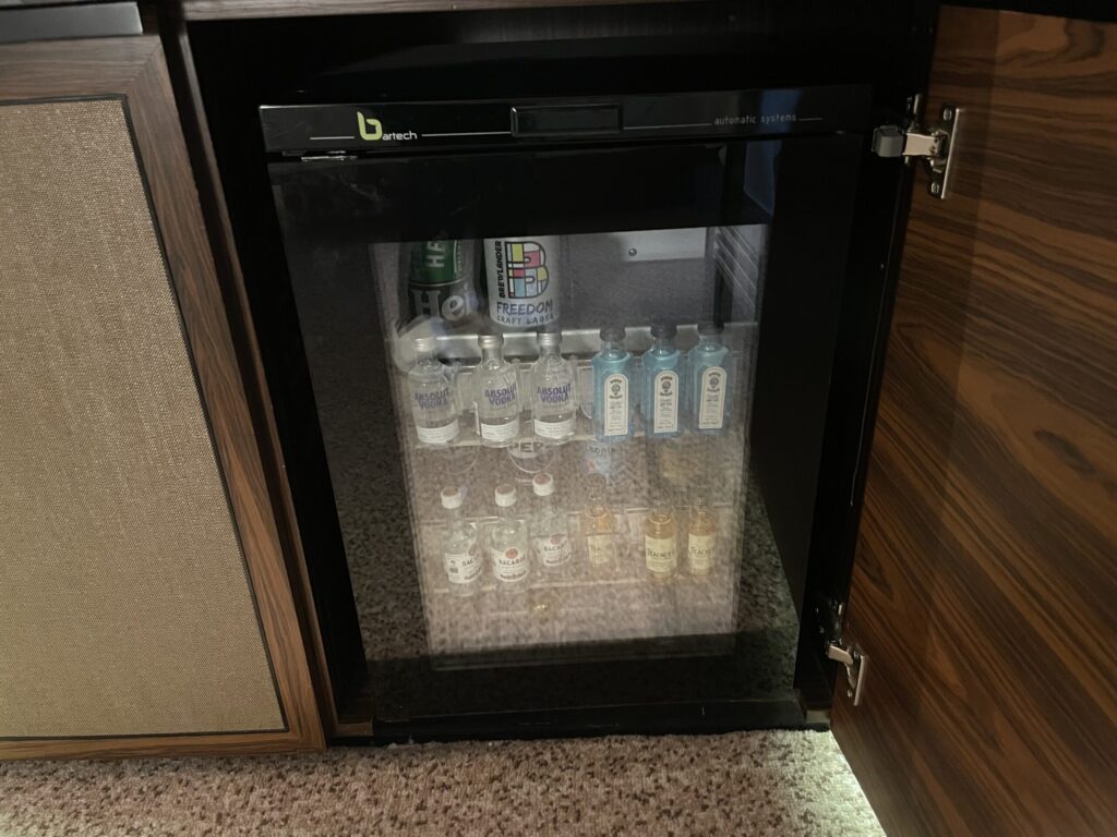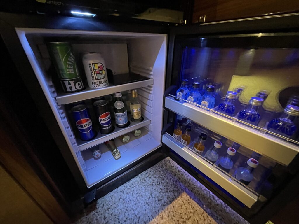 ✅️ ミニバー・冷蔵庫:冷蔵庫内には有料ドリンクが豊富に並び、右上には自分用のスペースもあり便利