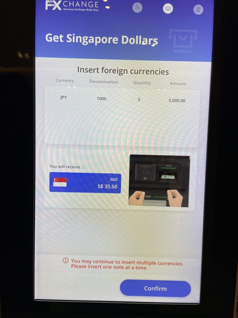 レートはめちゃくちゃ悪かったのですが、両替所に立ち寄る時間がなかったため、ロビーで5,000円だけシンガポールドルに換金しました。