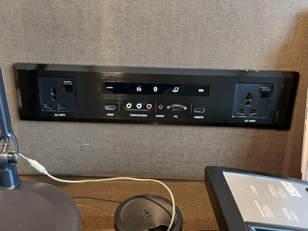 ✅️ デスク周り:社長が座るような立派な椅子とデスク。ユニバーサル電源が2口、USBポート付き。