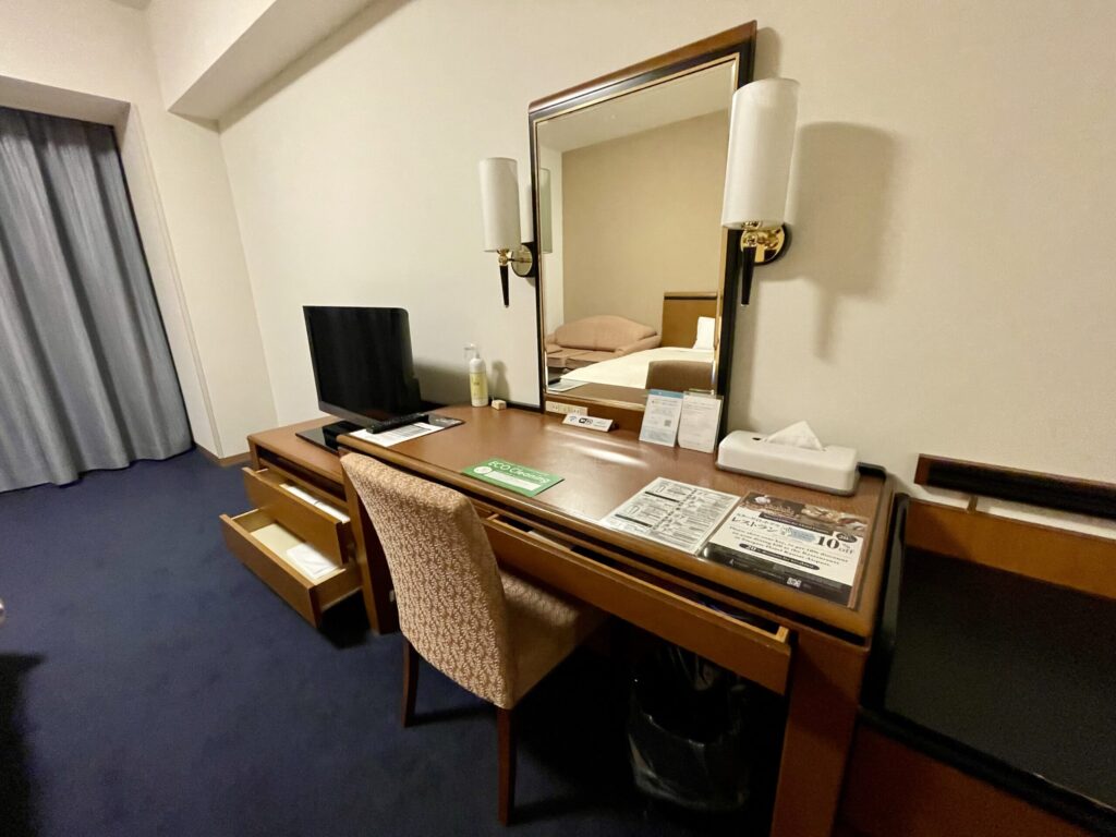 室内の雰囲気としては、全体的に“平成レトロ感”のあるデザインで、最新型のホテルというより落ち着いた雰囲気の客室です。
