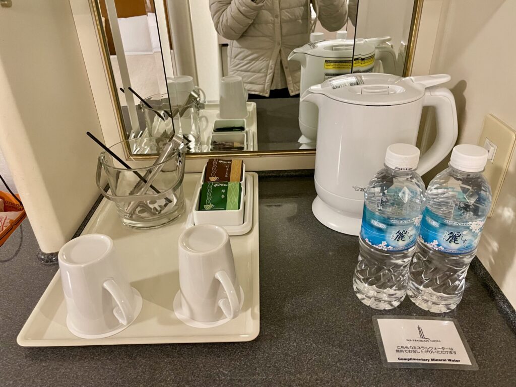 ✅️ 飲み物セット:ミネラルウォーター2本、電気ケトル、煎茶ティーバッグ