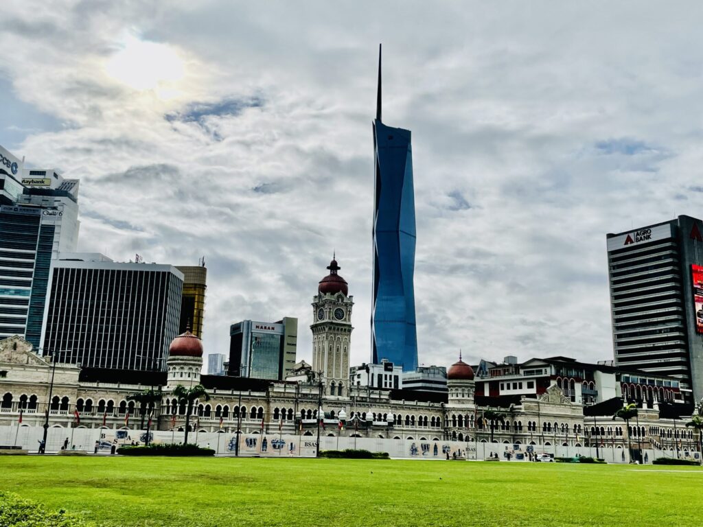 広大な芝生と抜けるような青空のコントラストが美しく、周囲にはコロニアル様式の歴史的建築が立ち並び、クアラルンプールの中でもどこか落ち着いた空気が流れています。